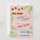 Guarde a data em Palm Primaveras, Miami ou qualquer local do Desert Sunny. Apresenta sinais em forma moderna do século Médio, piscina de natação, folhas de palma e fontes divertidas com uma vibração retrorreflectora moderna. Cores cor-de-rosa, verde, laranja e azul macio. Todos os textos podem ser alterados, exceto para "salvar a data". Para fazer mais mudanças, vá para Personalizar este modelo. Na parte inferior você verá "Quer personalizar este design ainda mais? Clique em EDIT usando a ferramenta Design. Será necessário algum aprendizado, mas você pode mudar algumas das fontes e algumas cores, mover as coisas ou excluir o que você precisa. Você vai pegar o jeito disso.