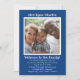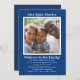 Festa de adoção, ou notem, por receber um novo filho à família - ou usar para o nascimento de um novo bebê. Cartões azuis escuros com texto branco e um modelo de foto quadrada no topo, emoldurados em branco. O nome do cheio da criança está acima da foto, com o texto "Bem-vindo à família" abaixo. Todas as informações sobre a parte/adoção podem ser adicionadas no parágrafo abaixo. O inverso é uma cor azul mais escura e sólida. Este design funciona para qualquer criança de idade.
