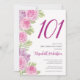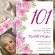 Este convite de aniversário de 101 anos com lindas flores em aquarela e samambaias com uma foto no verso é perfeito para uma festa feminina. Este design apresenta uma variedade de rosas cor-de-rosa e samambaias, um modelo de foto no lado reverso e é uma escolha feminina agradável para um evento especial para celebrar um aniversário marcante.