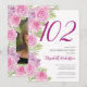 Este convite de aniversário de 102 anos com lindas flores em aquarela e samambaias com uma foto no verso é perfeito para uma festa feminina. Este design apresenta uma variedade de rosas cor-de-rosa e samambaias, um modelo de foto no lado reverso e é uma escolha feminina agradável para um evento especial para celebrar um aniversário marcante.