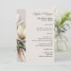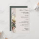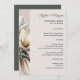 Cardápio de casamento com um tema do sul. As flores brancas de magnólia decoram a borda em papel bege rosa. O texto do menu está alinhado ao lado direito. Personalize com os nomes do casal no topo. O título e a data estão impressos em negrito, com todos os itens de menu listados no formulário de parágrafo. Adicione e remova espaços conforme necessário para o seu evento. O reverso é verde escuro sólido. Também vem como um download instantâneo para impressão ou compartilhar online.