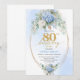 Celebrate a remarkable milestone with this 80th birthday invitation featuring one of today’s most trendy and elegant color combinations: blue and gold. Designed with soft watercolor blue hydrangeas, fresh eucalyptus greenery, and refined gold floral accents, this invitation brings a sense of calm sophistication and joyful celebration to an unforgettable occasion.