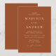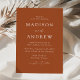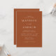 Convite de casamento minimalista e moderno com detalhes de seu casamento em letras brancas com acentos de escrita de caligrafia. O fundo de terracota pode ser alterado para uma cor de sua escolha. Projetado para coordenar com a nossa coleção de casamento do Modern Elegance.