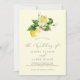 Este simples convite de casamento amarelo-limão moderno é perfeito para um casamento de primavera ou verão. O design mediterrânico rústico apresenta limões aquosos brilhantes e bonitos com flores brancas boêmicas e folhas verdes elegantes.