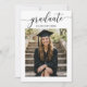"Celebrate your academic achievement with this modern and minimalist graduation announcement. The front features a large portrait photo framed by elegant hand-lettered brush script, while the back offers a stylish four-photo collage to showcase your favorite memories. This clean black and white design is perfect for high school or college graduates looking for a sophisticated way to invite friends and family to their graduation party or reception."