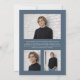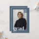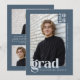 Celebrate your graduate's achievement with a sophisticated edge using this modern graduation announcement, which features a cool, slate blue background paired with light steel grey typography. The minimalist design is anchored by a large, lowercase serif "grad" overlay that adds a contemporary, editorial feel, while the school name runs vertically along the side for a sleek, structured look. A distinct block in the upper corner highlights the class year, balancing the composition and drawing the eye to the central photo. Ideally suited for a masculine or gender-neutral aesthetic, this template allows for full customization of the senior portrait, name, and school details, resulting in a professional and polished announcement that steers clear of traditional clutter. On the back, add a 3-photo collage and a custom message. © Kimbellished, LLC