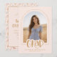 Celebrate your graduate's big achievement with this trendy, double-sided design that combines a stylish announcement with a fun party invitation in a girly aesthetic. The front features a modern blush pink and gold palette with your graduate’s photo cropped into an elegant arch frame, accented by the word "GRAD" in playful handwritten script. The back continues the celebration with a Grad Party invitation surrounded by a whimsical border of hand drawn colorful confetti swirls and stars, topped with a sweet coquette-style bow. This 2-in-1 card is fully customizable, allowing you to easily add your graduate's name, school, class year, and party details for a chic and memorable keepsake. © Kimbellished, LLC