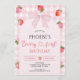Berry first birthday invitation template for girl featuring various strawberries and white daisies on a pink gingham pattern background and arch. This berry first birthday invitation also features a pink bow, heart font heading and is ideal for a girls berry themed first birthday party.