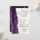 The left-hand edge of this elegant modern wedding invitation features a purple watercolor agate border trimmed with faux gold glitter. The customizable text combines gold colored handwriting with black copperplate and italic fonts on a white and gray marble background. The reverse side features a matching purple and gold agate design.