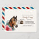 Modern Horse Race Derby Party Invitation with an illustration of a race horse with jockey and striped pattern on the back. All text elements can be changed so this design can be used for other events too: classy equestrian wedding invitation, horse birthday party, derby watch party, horse barn opening and more. Background, color of the illustration and text colors can be changed using the design tool!