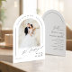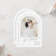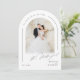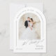 Minimalist wedding invitation features modern script and chic arch frame with couple's photo in black and white, elegant and simple, great for modern classy wedding.