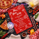 This playful and appetizing design bursts with fun energy on a vibrant red background, featuring whimsical white line art doodles of pizza slices dripping cheese, a margherita pizza, pizza paddle, maracas, mushrooms, tomatoes on the vine, a teddy bear, and a baby bottle for a cheeky food-meets-baby twist. 🍕🍼 The hand-drawn style adds a lively, hand-sketched charm with swirling vines and bouncy elements, creating a joyful, celebratory vibe full of humor and delicious anticipation perfect for a girl's lively shower. ✨