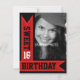 Um design preto e vermelho brilhante muito moderno e na moda que funciona bem com fotografias pretas e brancas da sua filha celebrando seu doce 16º aniversário! Este design apresenta fitas vermelhas intensas com estilo pontilhado ousado com letras de blocos esportivos universitários em preto e branco na frente, com uma grande área de modelo de foto. Convide todas as amigas meninas dela para uma celebração especial de aniversário com este cartão bonito feminino, de alta moda e de moda.
