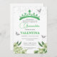 Um moderno sábio, borboletas florais verdes Quinceañera, um cartão de convite com brilho prateado combina elegância e sofisticação. O fundo verde macio é adornado com delicados arranjos florais e borboletas flamejantes, criando uma estética sonhadora e inspirada na natureza. Acentos de brilho prateado acrescentam um toque de brilho, melhorando a sensação real e celebratória do design. Uma silhueta ao estilo da princesa ou tipografia luxuosa em prata cintilante completa o olhar, fazer perfeito para uma celebração na moda e encantadora de Quinceañera.