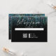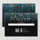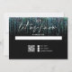 RSVP moderno abstrato - uma grinalda ousada e espelhada de tons de azul turquesa cai pela página, em caligrafia manuscrita está "deixe-nos saber" - iniciais do casal no topo - o resto do texto é simples e limpo - tudo sobre um fundo preto. Papelaria de casamento elegante.