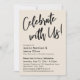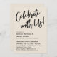 Neste design simples, as palavras-chave "Celebre conosco!" foram renderizadas em uma fonte de letra manuscrita e adicionadas como um arquivo de imagem gráfica. Todo o outro texto é editável e usa uma fonte versátil com serifa que você pode editar como quiser. A parte de trás apresenta "Sr & Sra" na mesma fonte moderna; isso pode ser removido se você preferir ter apenas um fundo simples ou desejar adicionar algo diferente. Todas as camadas foram adicionadas separadamente e deixadas destrancadas para lhe dar o máximo controle de design; edite esta aparência tanto quanto você precisar e mude a cor do fundo para qualquer cor que você goste. // 105 //