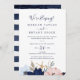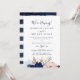 Este convite de recepção de casamento com tema floral náutico moderno é perfeito para uma festa pós-casamento em um cruzeiro ou na praia. O design caprichoso apresenta flores em aquarela rosa e azul-marinho com detalhes de estrelas-do-mar em dourado, dando um clima praiano. Cartões de RSVP são vendidos separadamente, ou você pode adicionar as informações de RSVP no verso do cartão.