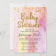 Então, Trendy, este convite apresenta um fundo de aquarela cor rosa e letras falsas em ouro e confetti caindo no fundo.