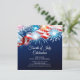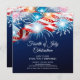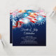 O convite moderno para fogos de artifício no dia 4 de julho, com fogos de artifício azuis, vermelhos e brancos e a bandeirola americana, está definido em fundo azul. Sacudir da parte de trás do nosso feriado patriótico de verão para ver uma correspondência de volta. Na moda convite para um churrasco comemorativo do dia 4 de julho, biscoito do dia do trabalho, festa do dia do trabalho ou qualquer partido patriota temático.