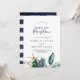 Este convite de receção de casamento náutico moderno com folhagem é perfeito para uma festa de pós-casamento na praia. O design botânico apresenta belas folhas verdes com flor navy e acentos de estrelas-do-mar douradas, dando-lhe um ambiente praiano. Os cartões de RSVP são vendidos separadamente, ou pode adicionar informações de RSVP no verso do cartão.