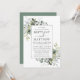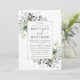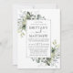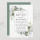 O Cartão de Convite para Casamento de Cores Biológicas Elegantes Modernos inclui folhas de eucalipto, folhagem botânica verde, folhas azuis empoeiradas e outros belos lençóis botânicos. Quadro De Prata, Texto De Cinza, Verso De Sage