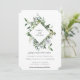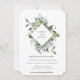 Elegante moldura em forma de diamante botânico aquarela, convite de casamento. Folhas e ramos botânicos verde sage delicados e arejados com flores brancas suaves. Verso do cartão apresenta cor sage empoeirada sólida.
