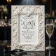 Defina um tom de elegância atemporal para o seu evento de gala com este design sofisticado, apresentando uma paleta monocromática clássica e intricado trabalho de enrolamentos.Este design apresenta uma renderização digital de alta definição de uma moldura ornamentada e escultural inspirada na arte barroca e rococó. A composição visual inclui cisnes simétricos formando um motivo de coração central, rodeado por folhas de acanto enroladas e rosas delicadas em relevo floral. A paleta de cores utiliza tons de branco suave, marfim, creme e cinza pálido para simular a aparência de gesso ou pedra talhada. A tipografia combina uma escrita caligráfica romântica e fluida com uma fonte serifada tradicional para máxima legibilidade e estilo.Esta é uma imagem impressa plana com um efeito de relevo falsamente embutido, não material real elevado, gesso ou textura 3D