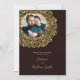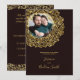 Este design de convite tem um tema luxuoso e elegante. A página frontal apresenta um fundo marrom profundo com padrões florais dourados ornamentados formando uma moldura circular no topo, onde uma foto personalizada pode ser colocada. Todo o texto é editável, permitindo a personalização de nomes, detalhes do evento ou mensagens. As fontes são elegantes e sofisticadas, com um acabamento dourado que complementa a moldura decorativa, dando ao design geral um sentimento de classe e celebração - perfeito para uma ocasião de aniversário.