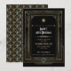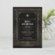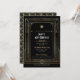 Uma moldura dourada ornamentada no estilo Art Deco convida os convidados para uma festa temática dos anos 20, seja uma festa de aniversário, chá de noiva, festa de noivado ou festa de aniversário de casamento. Ornamentos dourados decorativos no estilo Art Deco se destacam contra o fundo preto rico para acentuar o design. O verso é um padrão geométrico dourado sólido no estilo Art Deco. Disponível com produtos correspondentes.