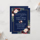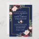 O Convite para Casamento Floral Moderno Elegante de Aquarela inclui rosas burgueses, rosas cor-de-rosa, flores vermelhas, flores azuis e verde botânico. Fundo Azul marinho. Dourado quadro.