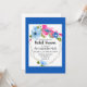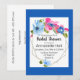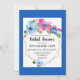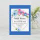 Um deslumbrante buquê de flores azuis claras, rosa vibrante e azuis escuras adorna este convite moderno de chá de panela de noiva.