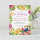 Este vibrante design em aquarela apresenta flores tropicais ousadas, folhas de monstera verde exuberantes e impressionantes flores de ave-do-paraíso que emolduram o layout. Um tucano lindamente ilustrado empoleirado entre flores exóticas adiciona um ponto focal animado e inspirado na ilha, enquanto os acentos de confete dourado espalhados trazem um brilho sutil de celebração.