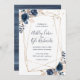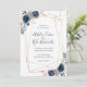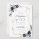 Convite geométrico de casamento em marinho, ouro, e borrão com flores acentuando o quadro. Douradas marcas de aquarela decoram a parte superior da placa. A parte traseira da placa é projetada com fundo de marinho azul d'água. Você pode adicionar todos os detalhes do seu casamento ao cartão. Se precisar fazer mais alterações, você pode clicar no link/botão personalizar e alterar coisas como tamanho da fonte, estilo da fonte, cor da fonte, etc.