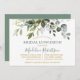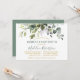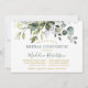 O Cartão de Convite para Chás de panela de Lunco de Cor Biológica Elegante Moderna inclui folhas de eucalipto, folhagem botânica verde, folhas azuis empoeiradas e outros belos lençóis botânicos. Script de caligrafia de tendências. Texto Dourado. Sage Green Back.