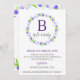 Um grande "B" roxo e monogramado está dentro de uma coroa de flores de cores suaves para nossos Convites de Chá de Bebê B é para Bebê.