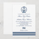 Defina o tom para uma celebração costeira clássica com este convite de casamento apresentando um brasão de monograma de âncora azul e destaques de faixa azul ousada. O fundo branco limpo e os nomes em letra cursiva elegante parecem atemporais, nítidos e fáceis de personalizar. Perfeito para casamentos na praia, clube de iates e temas náuticos.
