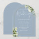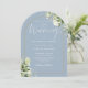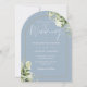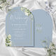 Este convite de casamento com arco dourado floral botânico azul empoeirado elegante pode ser personalizado com suas informações em tipografia chic com suas iniciais monograma no verso. Projetado por Thisisnotme©