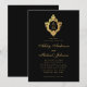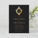 Este convite de casamento preto e dourado com um ar vintage tem uma crista floral vintage em folha de ouro falso, que contém o monograma. Os nomes da noiva e do noivo são escritos em uma elegante caligrafia. Todo o texto pode ser personalizado e tem uma cor dourada semelhante à crista de ouro falso. O fundo é preto.