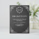 Cartão de recepção elegante com uma borda branca ornamentada e um monograma lindo contra um fundo de quadro negro.