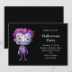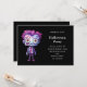 Convite para festa de Halloween com ilustração fofa. Monstro de Frankenstein com cabelo rosa e roxo e terno e gravata elegantes.