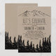 Este convite rústico de celebração na montanha é perfeito para uma festa de noivado na floresta. O design inspirado na natureza apresenta a silhueta de uma floresta de pinheiros e montanhas em papel kraft falso. Este convite é perfeito para uma festa de noivado, despedida de solteira ou qualquer evento ou festa.