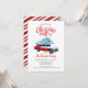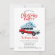Cartões de convite para férias da Festa de Natal com carrinho vermelho e pinheiro com neve. As cores são: vermelho, branco. Personalize-os adicionando suas informações. Perfeito para casa, casa, escritório, empresa, festa de eventos.