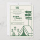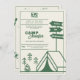 Um modelo de convite itinerário do aniversário de 30 anos, moderno, elegante e chic, com tema de acampamento, com desenhos minimalistas de uma tenda com montanhas, árvores e cartazes, posta o título, "Vamos Go Camping", e outros símbolos bonitos, desenhados à mão para um mapa e outros acampamentos (marshmallow torrado etc.). Uma opção moderna e divertida para uma mulher que faz trinta anos num glamouroso fim de semana de acampamento, caminhada ou em qualquer lugar ao ar livre, em verde florestal suave, ao ar livre e num estilo moderno minimalista.