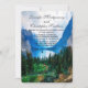 Um convite de casamento com uma bela fotografia de uma cena agradável e tranquila da natureza. Floresta verde vibrante na frente e montanhas azuis sombrias nas costas. Com um céu branco nublado e sonhador. Mistura e mágica.