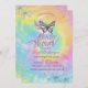 A cute baby shower invitation features a tie-dye background with butterflies. These baby shower invitations are easily customized for your event by simply adding your details.