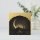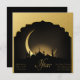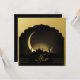 Convite para celebrações Iftar ou Eid para Ramadã em tons de ouro e preto. Design tem uma borda dourada, mesquita-contorno, fundo decorativo de ouro e lua crescente com a silhueta de uma mesquita em preto.