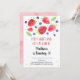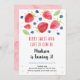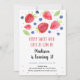 Este adorável convite apresenta a minha mão pintada de morangos e mirtilos com falsos confetti de brilho dourado.