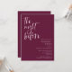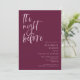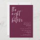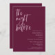 Um convite minimalista de janto de ensaio de casamento com uma letra moderna que diz "na noite anterior". A cor de fundo é vermelho de morango.
