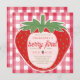 Um convite fofo, doce e elegante para o 1º aniversário de uma menina, com o tema "berry first" (primeiro aniversário "de fruta"), apresentando uma ilustração de um morango gigante com o centro como moldura para o texto, sobre um padrão xadrez vermelho. O título, "Berry First", está em caligrafia moderna. No verso, um caprichoso padrão xadrez em vermelho e branco combinando. Uma adorável moldura de fruta doce em aquarela para celebrar o primeiro aniversário da sua pequena fruta. Perfeito para uma festa de aniversário de primavera ou verão.