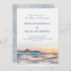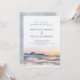 O convite para o casamento de destino do tema da praia apresenta uma pintura a aquarela de Morro Rock (Baía de Morro, Califórnia), areia, mar e pôr do sol em tons costeiros de azul, cinza e coral. Arte da KL Stock.